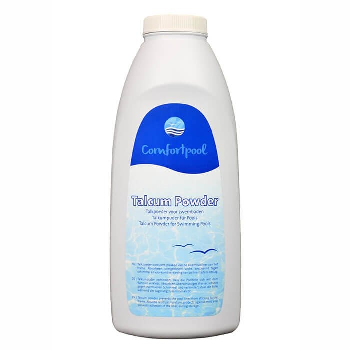 Talkpoeder voor zwembaden, met makkelijke strooidop. Talkpoeder voorkomt plakken van de zwembadliner aan het frame. Het absorbeert overgebleven vocht, beschermt tegen schimmel en voorkomt verkleving van de liner tijdens opslag. Aanbevolen gebruik tijdens het zwembad opzetten: strooi royaal talkpoeder in de openingen van de zwembadliner voor u het frame hierin schuift. Aanbevolen gebruik tijdens het zwembad opbergen: breng voor het opvouwen talkpoeder aan op de liner, en strooi royaal in hoeken en vouwen. Inhoud: 600 gram talkpoeder.
