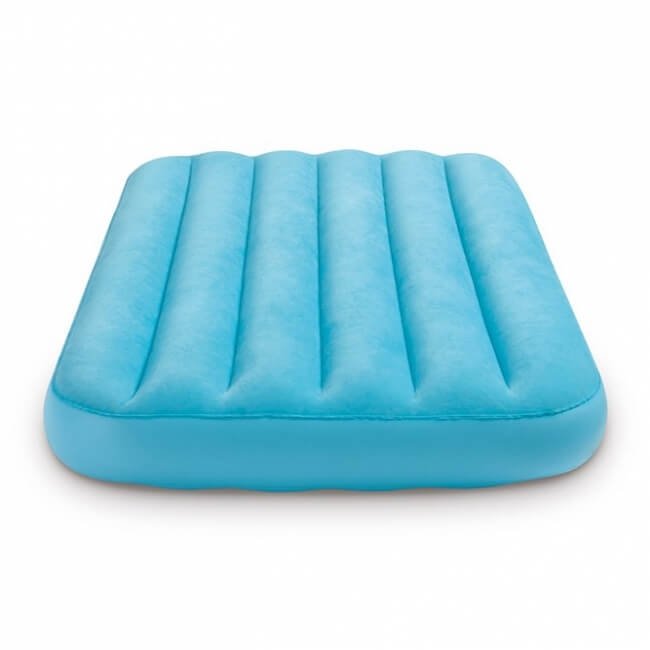 Kinderluchtbed, geschikt voor kinderen van 3 tot 10 jaar. Het luchtbed is bekleed met een fluweelzachte geflockte laag, voor extra comfort, en verkrijgbaar in twee vrolijke kleuren: blauw en oranje.