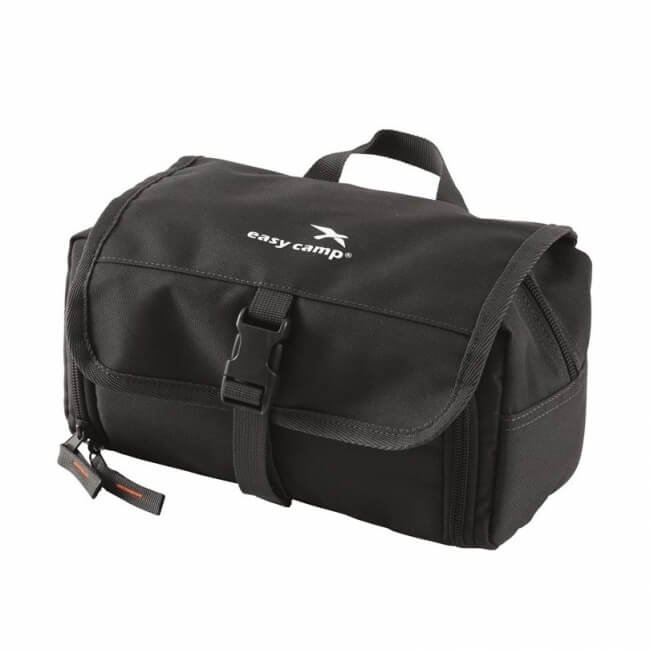 De Easy Camp toilettas is opgedeeld in een hoofdvak en twee aparte zijvakken met ritssluiting. Aan het handvat is de toilettas handig mee te nemen, aan de meegeleverde haak is hij vervolgens makkelijk op te hangen. Er zit tevens een spiegeltje in, in een beschermhoesje.