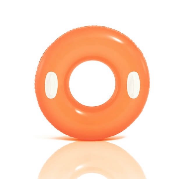 Grote gekleurde zwemband met 2 witte handgrepen. De zwemband is gemaakt van 0.20 dik vinyl en is verkrijgbaar in de coole neonkleuren oranje, geel en roze.