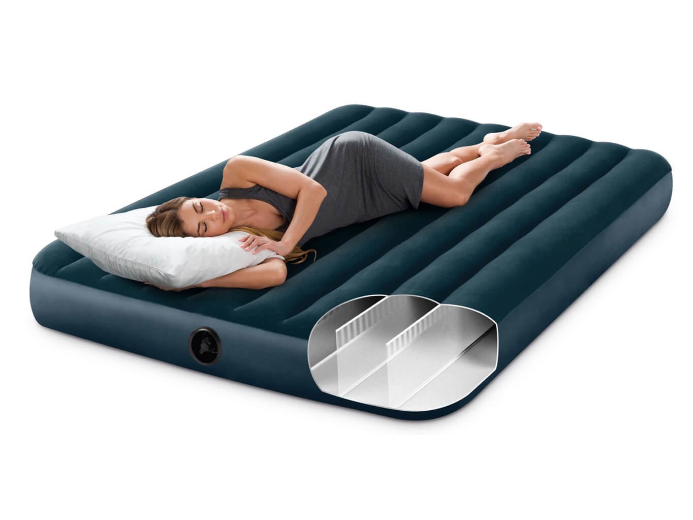 Een Intex Dura-Beam Downy luchtbed, met Dura-Beam binnenstructuur voor optimale lichaamsondersteuning, stabiliteit en slaapcomfort. Het Dura-Beam Downy luchtbed is gemaakt van duurzaam vinyl met een geflockte toplaag op het ligoppervlak. Het luchtbed is voorzien van een 2-in-1 ventiel, waardoor het snel op te pompen en is, en na gebruik ook weer snel leeg is. Het Dura-Beam Downy luchtbed is geschikt voor zowel gebruik binnenshuis als op camping.