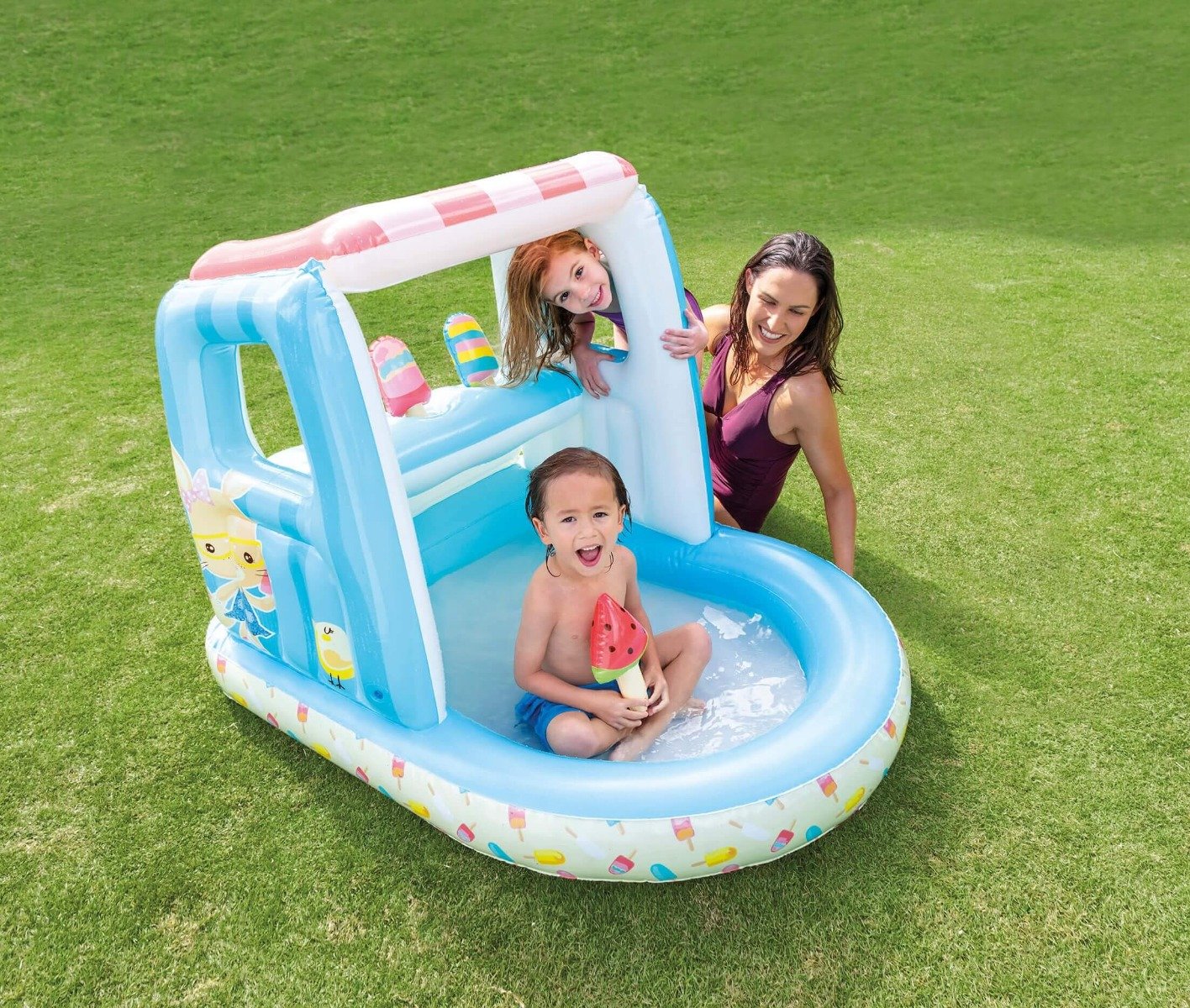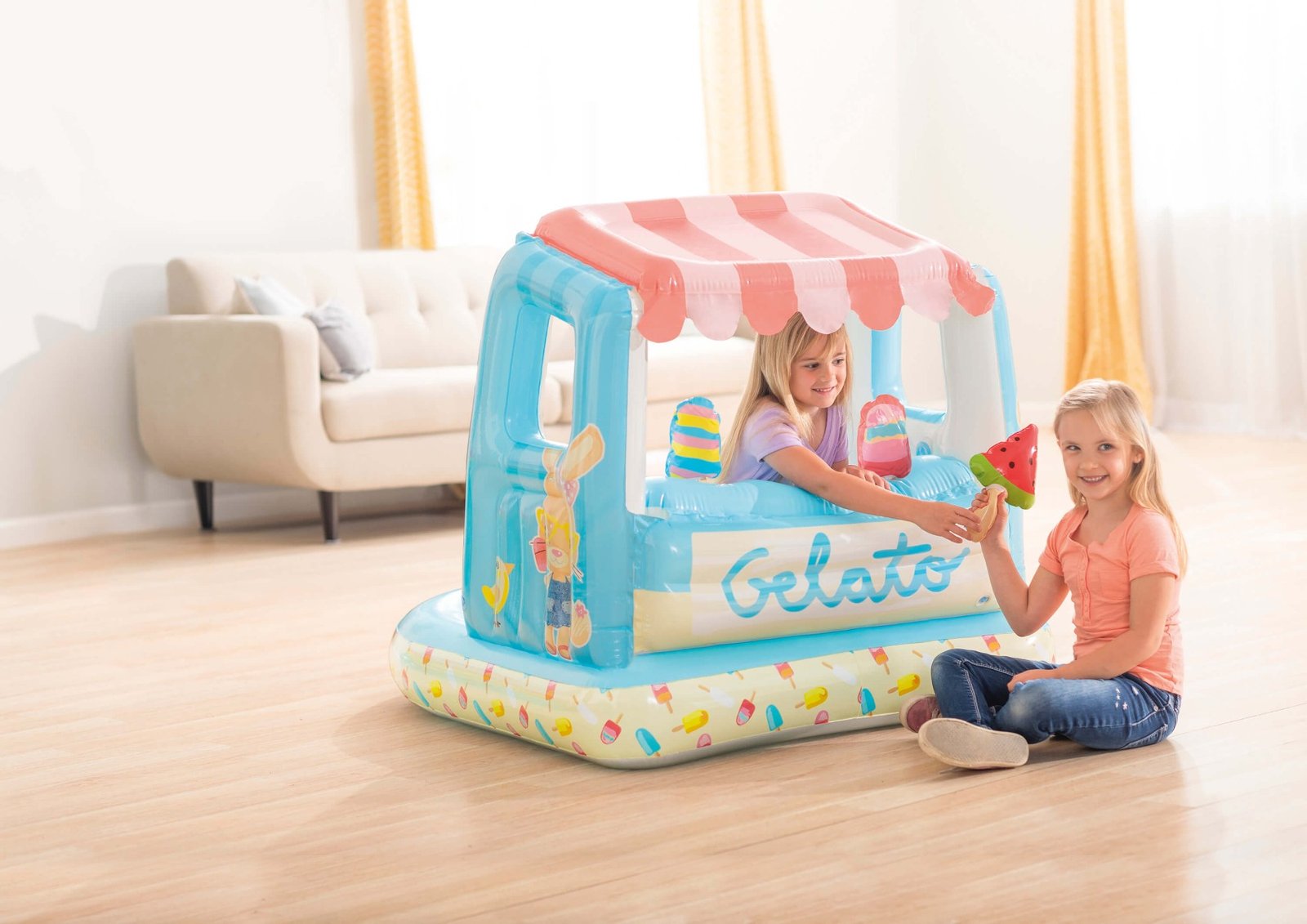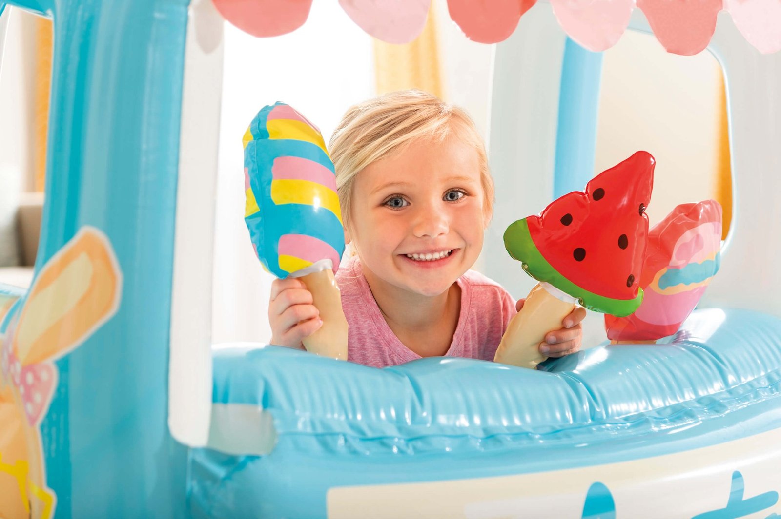Opblaasbaar speelhuisje in de vorm van een ijskraam, inclusief drie opblaasbare ijsjes. Het speelhuisje kan zowel binnen als buiten gebruikt worden. De achterkant van het speelhuisje kan bovendien gevuld worden met water zodat het een klein zwembadje wordt.
