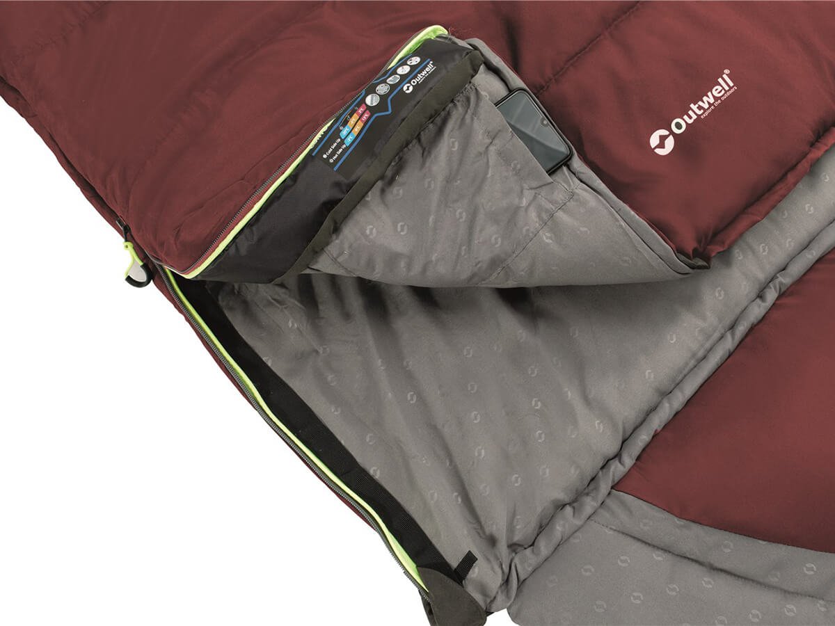 De Outwell Contour is een comfortabele slaapzak die geschikt is voor gebruik in 3 seizoenen, van de late lente tot de vroege herfst, tot temperaturen net boven het vriespunt. De slaapzak is gevuld met twee lagen Isofill isolatiemateriaal en is omkeerbaar, met een koele en warme kant. Je kunt hier tussen wisselen door de slaapzak binnenstebuiten te draaien. De comfortwaarde is voor mannen -3°C, voor vrouwen 3°C met de koele kant, en 11°C en 15°C met de warme kant. Aan de slaapzak zit een praktisch, zacht kussen vast, al is dit er eventueel ook af te ritsen. De slaapzak is geheel open te ritsen tot een tweepersoons deken en twee slaapzakken kunnen aan elkaar worden geritst tot een grote tweepersoons slaapzak. Binnenin de slaapzak zit een handig opbergvakje en bevestigingslussen voor een mogelijke binnenlaken. De slaapzak is geschikt voor mensen tot 1,90 m en wordt geleverd met een compressietas.